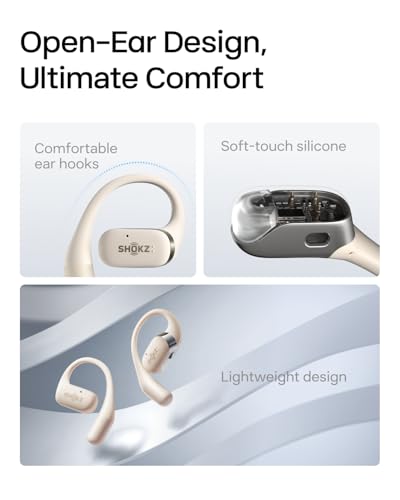 SHOKZ - SHOKZ OpenFit Open-Ear True Wireless Bluetooth Headphones with Microphone, Earbuds with Earhooks, Sweat Resistant, Fast Charging, 28HRS Playtime (Beige)