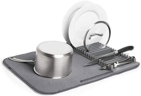 Shoping now - Dish Drying Mat, Dish Rack Organizer with Removable Tray,Rack and Microfiber Dish Drying Mat, for Kitchen Countertop, Sink - Drain and Dry Wine Glasses, Bowls, Dishes, GreyMAT with STAND