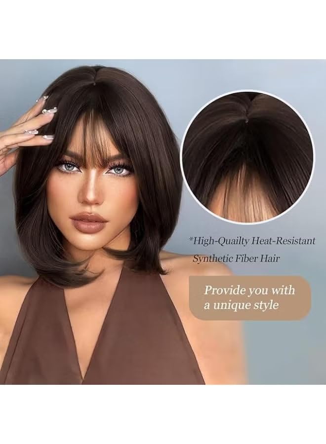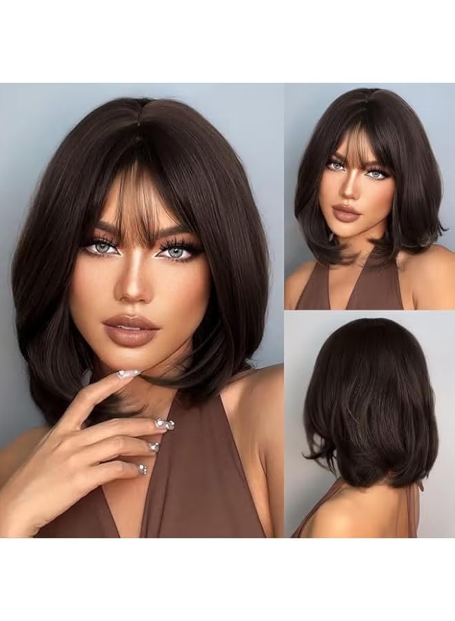 Generic - Short Bob Dark Brown Wig with Bangs – 12 Inch Shoulder Length Wavy Brown Synthetic Wig – Natural Looking Heat Resistant Fiber – Glueless Daily Wear Wig for Women, Parties & Cosplay