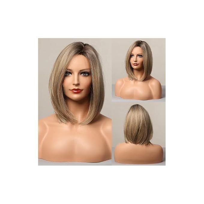 Generic - Short Bob Wig Synthetic Ash Blonde Wig Dark Roots Straight Hair