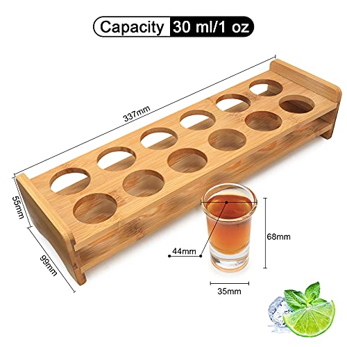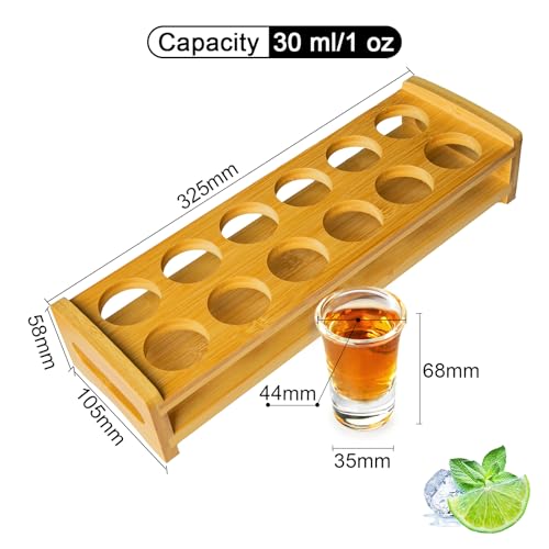 - 【Size and Capacity】: The holder is 337mm long, 99mm wide and 55mm high. The shot glass is round shape. The diameter is bottom 35mm, top 44mm and height 68mm. The capacity is 30ml. Perfect for taking a shot.