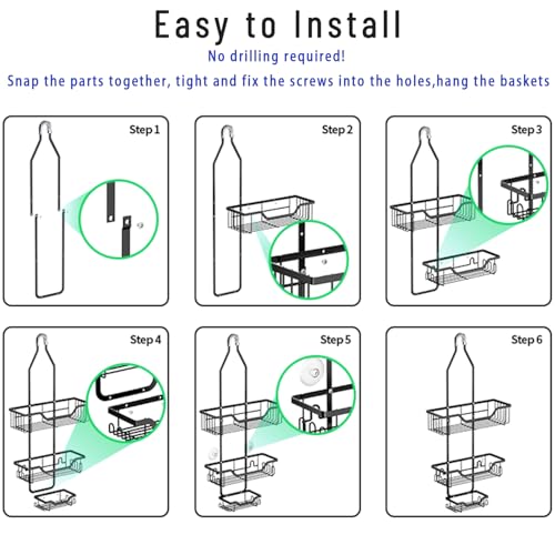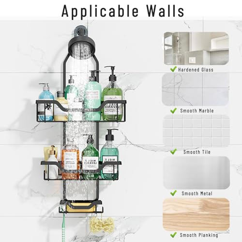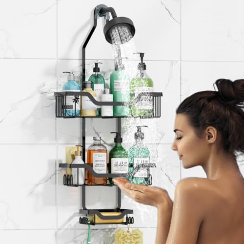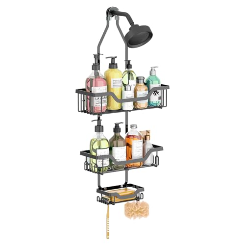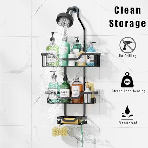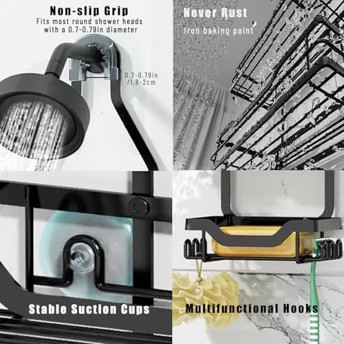 - Durable & Rustproof 💪: The bathroom caddy for shower is crafted from premium iron and coated with high-quality black paint, this shower caddy is built to last. This shower caddy over shower head can hold up to 40 lbs of toiletries. The shower head caddy maximizes the use of space in your bathroom, inside shower stall, or bath tub. The over shower head organizer is not just sturdy; the whole shower rack is rustproof, ensuring long-term durability even in the steamiest showers.