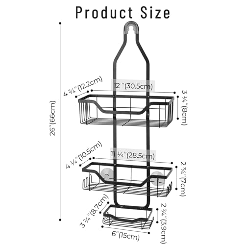 - Maximize Your Shower Space 📏: Transform your bathroom into an organized haven with our 3-tier and 12 hooks black shower caddy! This shower organizer hanging is designed to store various shower essentials, its spacious baskets securely hold shower gel, shampoo, and body lotions, ensuring they won’t tip over. The bottom soap basket is ideal for soap storage. 12 hooks hang razors, sponges, loofahs, toothbrushes, and towels. Everything you need is always within reach. Say goodbye to clutter and enjoy a neat, tidy bathroom every day. Dimensions: 12×4.75×26inches (L×W×H)