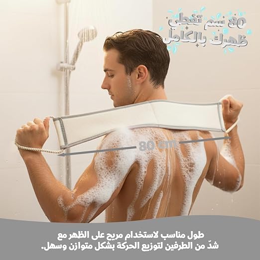 - 80 cm long back scrubber with strong strap allows comfortable control, so you can scrub hard-to-reach areas without bending or stretching.
