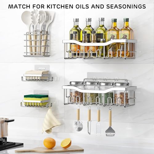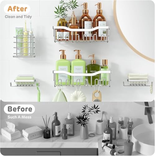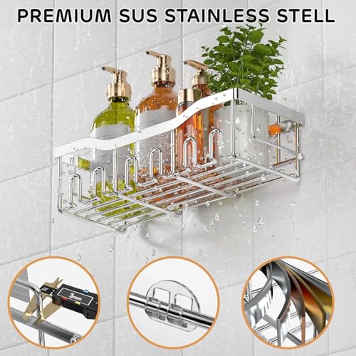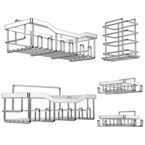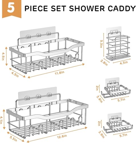 XIWAMA - منظم دش بدون ثقب لاصق من الفولاذ المقاوم للصدأ، أرفف دش سميكة مع حامل صابون وخطافات وسعة كبيرة للتخزين في الحمام والمطبخ، عبوة من 5 علب