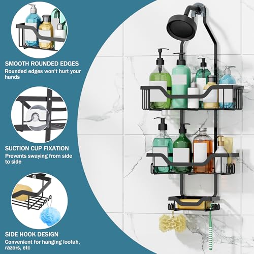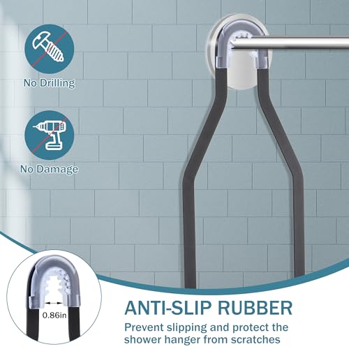 - Non-slip bathroom organiser - Thanks to the non-slip rubber circle on the top of the shower hanger and the accessories for wall mounting (2 suction cups), the shower hanger remains stable, even when the shower shelf is filled with bottles over the shower head, so you can be calm with every shower.