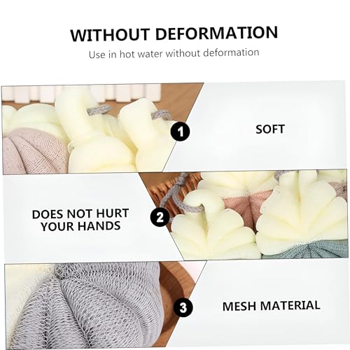 - This soft bath flower sponge is a versatile shower mesh pouf designed for a comfortable bathing experience, featuring dimensions of approximately 13x9x5 cm, made from durable polyethylene, and includes a hanging rope for easy suspension in the bathroom, ensuring convenient storage and quick drying after use.