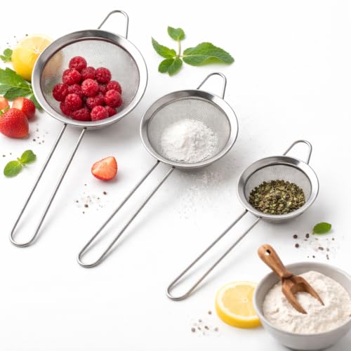 - 3 practical sizes for daily cooking – The 3-piece set gives you the right strainer every time, from sifting baking ingredients to washing fruits or draining pasta for family meals.