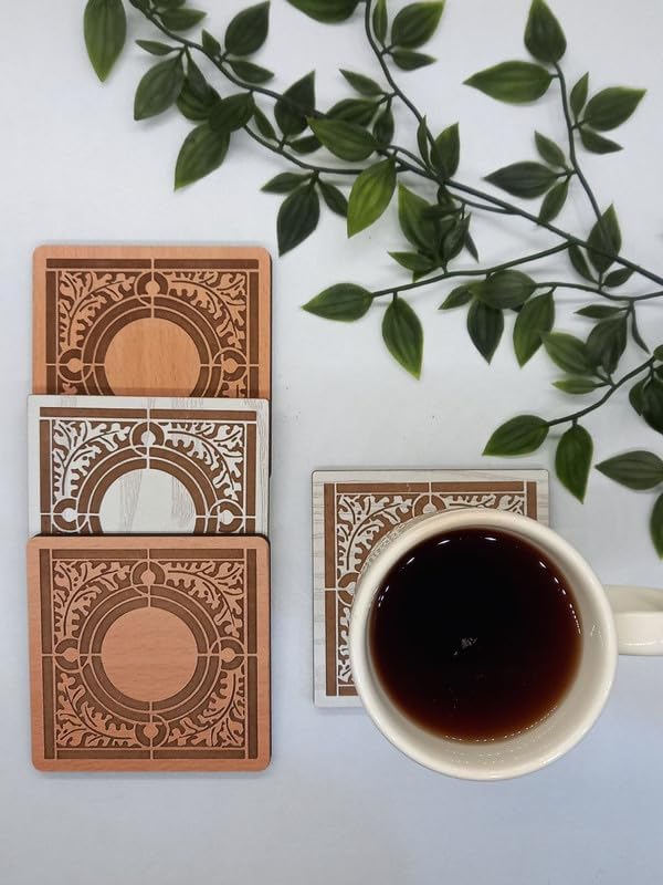 SIGN & DESINE - قاعدة اكواب/كوستر خشب بتصميمات مربعة ورود فنية حفر ليزر غائر، سمك 6 مللى 9.5 × 9.5 × 0.6 سم - هافان SCO FL 05M من ساين اند ديزاين