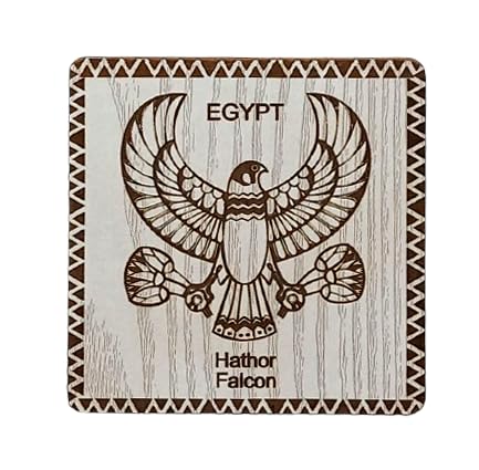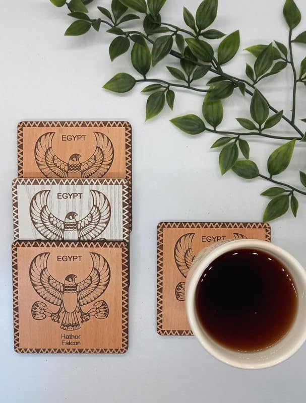 SIGN & DESINE - قاعدة أكواب وكوستر من الخشب مربعة بحفر ليزر غائر من ساين اند ديزاين، تصميم فرعونى حورس الطائر المجنح، سمك 6 ملم، مقاس 9.5 × 9.5 × 0.6 سم - بلون بيج