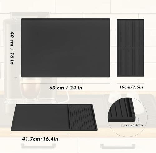 JINHEC - بساط قهوة من السيليكون لسطح المنضدة، بساط لانسكاب القهوة مع حواف مرتفعة، ملحقات بار القهوة، بساط ماكينة تحضير القهوة مقاوم للماء مع بساط تجفيف الاطباق قابل للفصل (اسود، 24 انش × 16 انش)