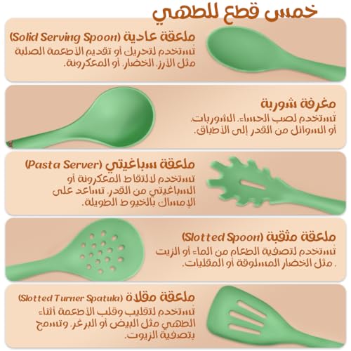 - مجموعة كاملة من 6 قطع: يتضمن طقم التوزيع المصنوع من السيليكون هذا كل ما تحتاجين إليه لمهام المطبخ اليومية: ملعقة سباتولا وملعقة مشقوقة وملعقة صلبة وملعقة لتقليب الطعام ومساكة طعام وحامل.