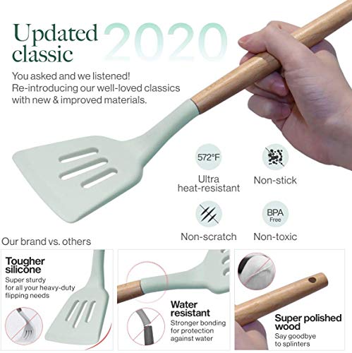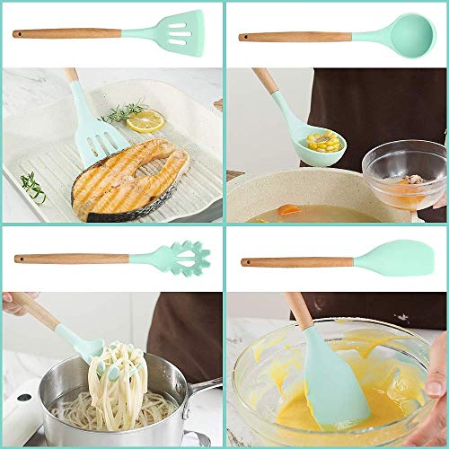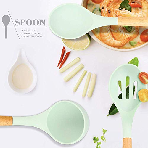 Nioslier - Silicone Cookware Sets - 9 Piece,r Natural Wooden Handles, Cooking Tools, Turner Tongs, Spatula, Spoon for Non-Stick Cookware (Mint Green)