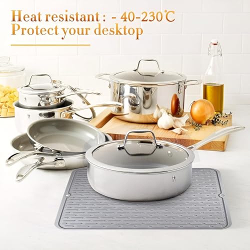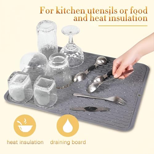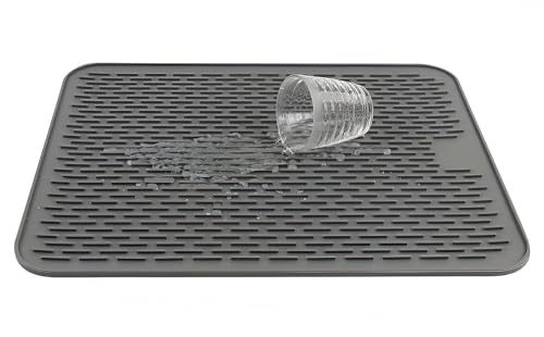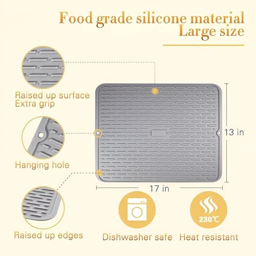 - Made from food-grade silicone, this drying mat is FDA-approved and heat-resistant up to 446°F. Its versatility allows it to double as a silicone pot holder, countertop protector, and heat mat, catering to a variety of kitchen needs. The durable material ensures it remains resilient to wear and tear, making it a reliable addition to any kitchen, especially for those who frequently work with temperature-sensitive items.