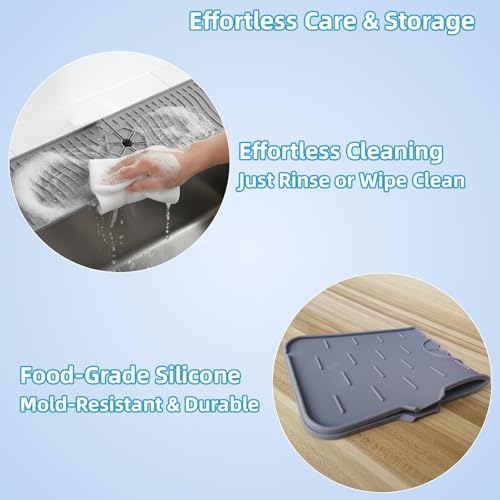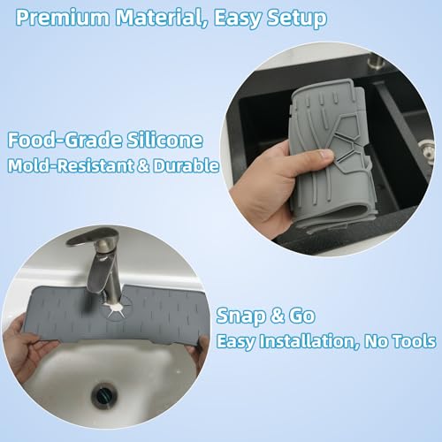 - 【Premium Silicone Material & Easy Clean】Crafted from 100% food-grade silicone, this silicone faucet mat for kitchen sink is a durable sink water splash guard that resists corrosion and odors. It's an easy-to-clean silicone sink mat, simply rinse and it's ready for reuse, making it a superior kitchen sink accessory compared to fabric mats.