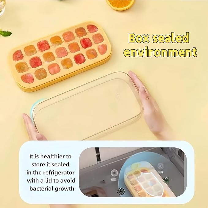 - 【𝐄𝐟𝐟𝐨𝐫𝐭𝐥𝐞𝐬𝐬 𝐈𝐜𝐞 𝐑𝐞𝐥𝐞𝐚𝐬𝐞】This silicone ice cube tray set ensures a simple, mess-free release of ice cubes with just a gentle push, eliminating the need for direct contact. Capable of producing 21 square ice cubes in one go, it provides a generous and convenient supply of ice. The included large lid doubles as a storage bin for ice cubes, food, or fruits. This innovative design offers a superior experience compared to traditional freezing trays, enhancing the entire process from making and releasing to storing ice cubes