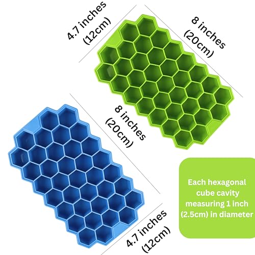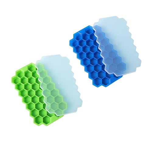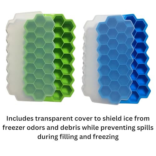 Generic - صينية مكعبات ثلج من السيليكون مع غطاء، عبوة من قطعتين (1 ازرق و1 اخضر)، قطر 1 انش، 37 قالب سيليكون سداسي امن للاستخدام في غسالة الصحون، صواني مكعبات ثلج على شكل خلية نحل للفريزر والميكروويف