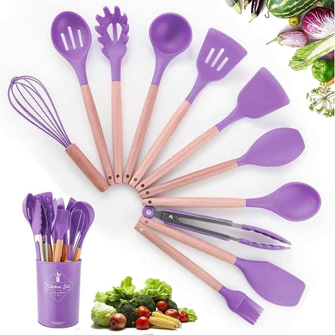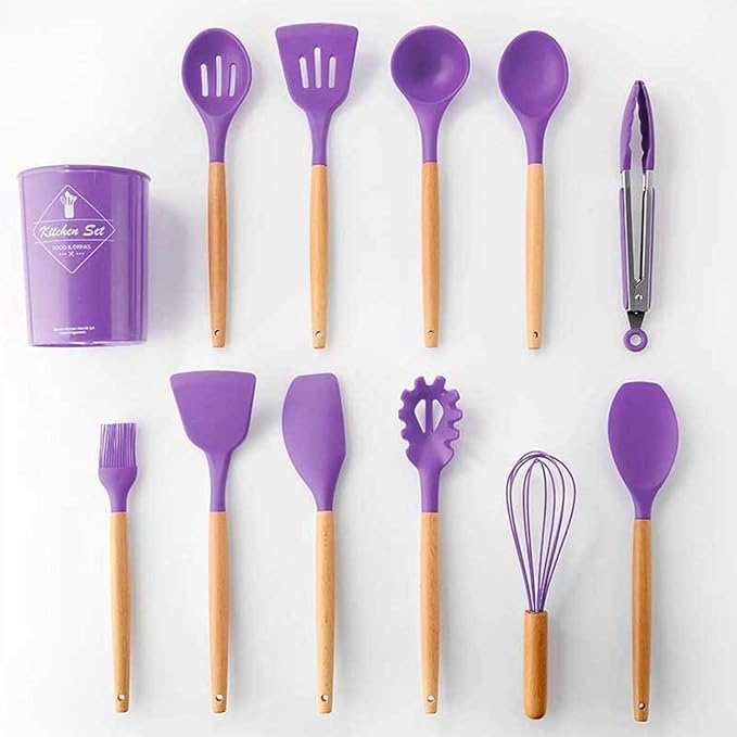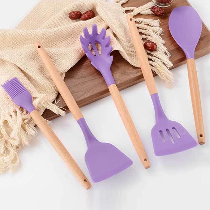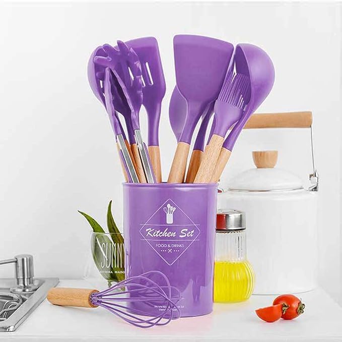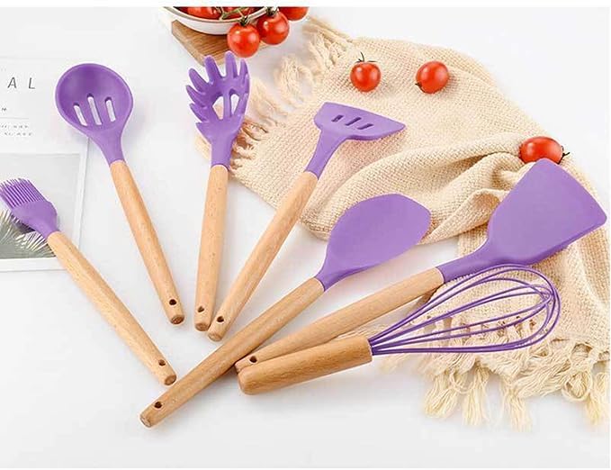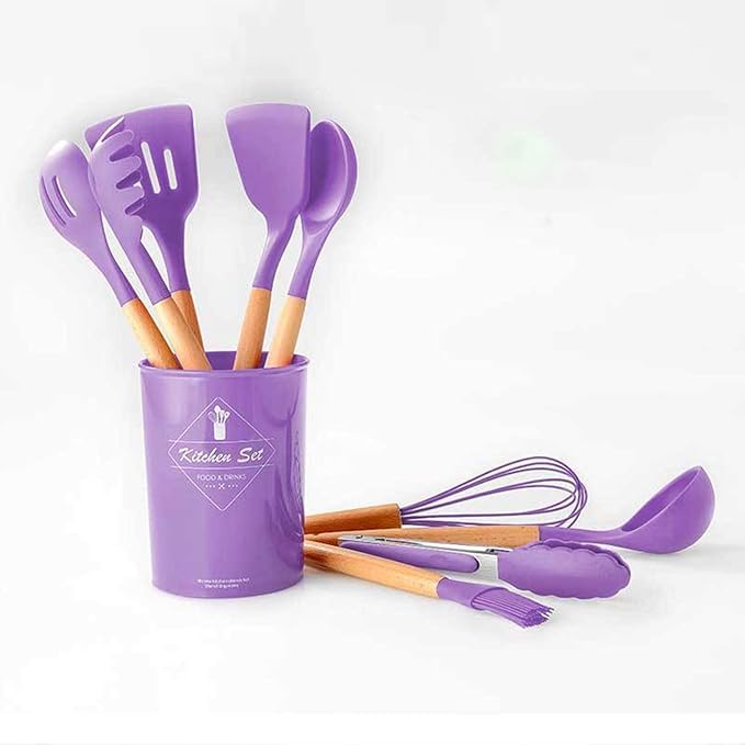 Generic - مجموعة أدوات مطبخ من السيليكون 12 قطعة، أدوات مطبخ مضادة للالتصاق ومقاومة للخدوش مع مقابض خشبية وحامل، أدوات تناول الطعام مقاومة للحرارة وآمنة للطهي (لون أرجواني)
