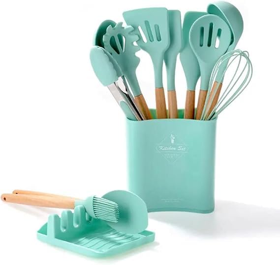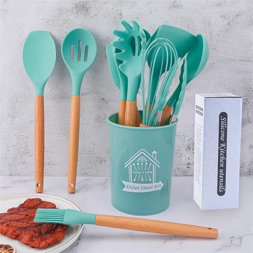Happy Square - Silicone Kitchen Utensil Set with Wooden Handles - 12 Piece Include Spatula, Turner Spoon, Food Tongs and More, with Stylish Holder for Easy Kitchen Organization (Light Green)