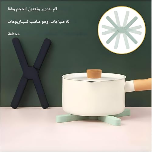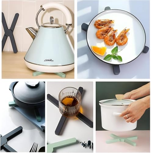 - This X-shaped foldable silicone pot holder is a versatile kitchen accessory designed to protect your countertops and tables from heat damage. Its foldable design allows for compact storage, saving valuable kitchen space when not in use. When unfolded, it provides a stable and reliable surface for hot pots, pans, and dishes, preventing unsightly heat marks and scratches on delicate surfaces. The vibrant color options available will also add a touch of personality to your kitchen decor, enhancing