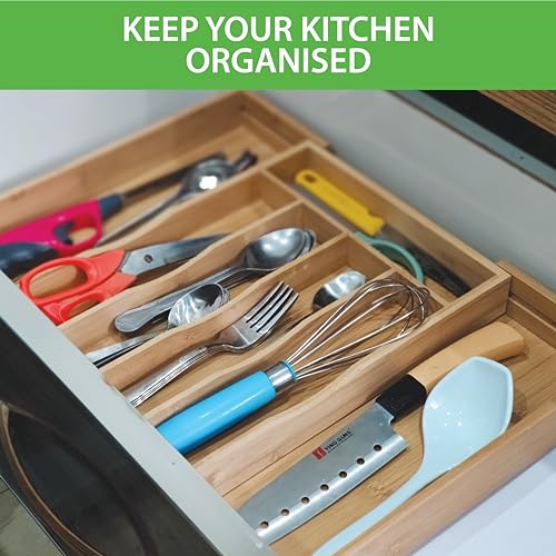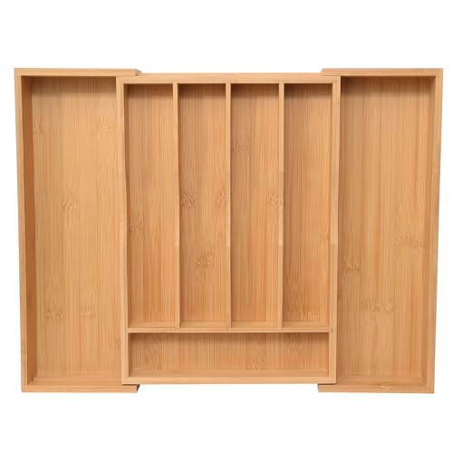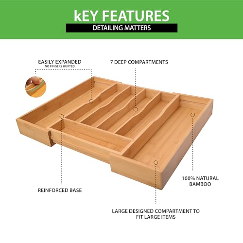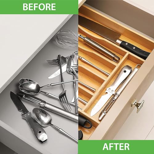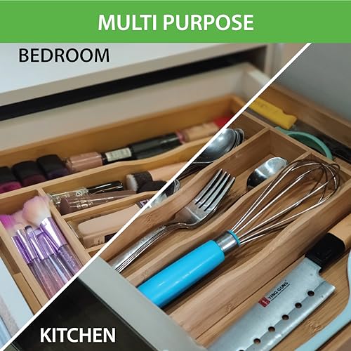 - 🍽️ ORGANIZE YOUR KITCHEN DRAWER: Our Bamboo Drawer Organizer is designed to arrange all your items in one place. Thanks to the silverware organizer expandable feature it can fit all standard drawer sizes and can shapeshift from 5 to 7 compartments. Save your time and space to organize multiple items perfectly.