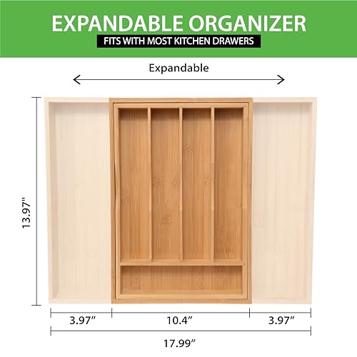 - 💡 PRECISION MEETS QUALITY MATERIAL: The Silverware Organizer Tray is crafted from premium, environmentally friendly Bamboo. Our Cutlery Drawer Organizer expands from 10″ to 18″ wide to fit from Mini to Mega. When fully expanded, it measures 14 x 18 x 2 inches; when completely closed, it measures 14 x 10 x 2 inches (PLEASE MEASURE YOUR DRAWER SIZE BEFORE PURCHASE).