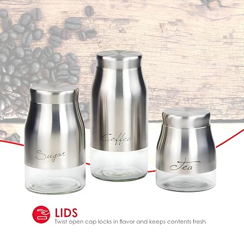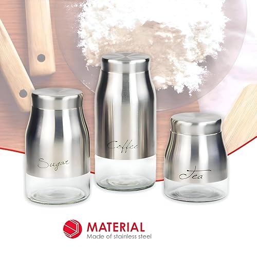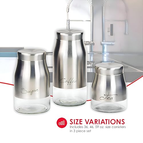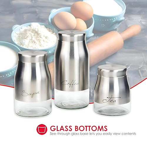 - The product is a three-piece stainless steel canister set featuring see-through glass bases, designed to let you spot contents at a glance, stack, and coordinate with a wide range of kitchen decors.