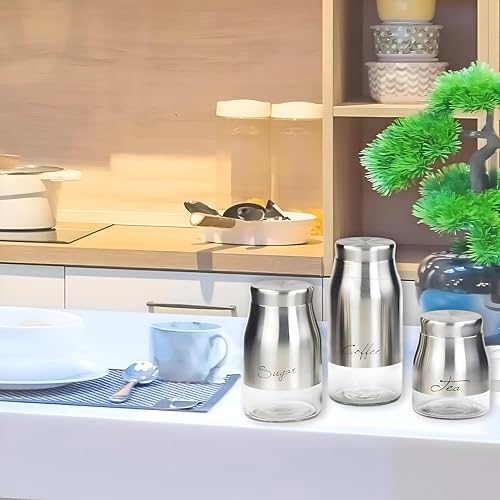 Generic - Silver Finish - Elegant 3-piece canister set in brushed stainless steel with glass bases, airtight lids, space-efficient stacking, and a refined silver tone to elevate kitchen counters and storage