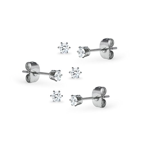 Silverline Jewelry - Silverline Jewelry 3 Pairs Stainless Steel 3mm Cubic Zirconia Round Stud Earrings Set for Women & Girls Assorted Colors, Metal,