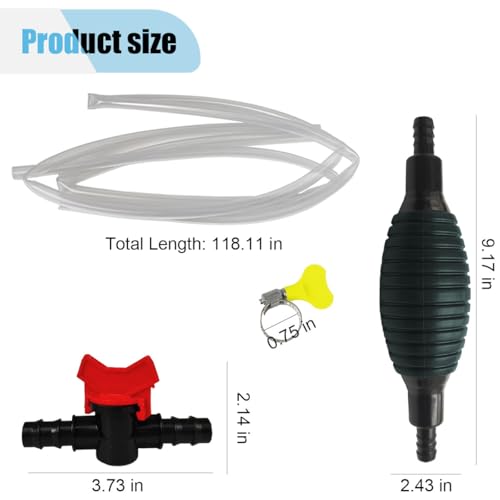 - 【Easy to Use】:This gas siphon hose pump is easy to use, first cut the hose into two sections, then fix the ends of the siphon pump with the snap with the hose, finally insert the hose into the liquid and press the siphon pump to carry out the liquid transfer work. To ensure good use, it is recommended that the source liquid must be 11 inches or more higher than the receiving liquid.