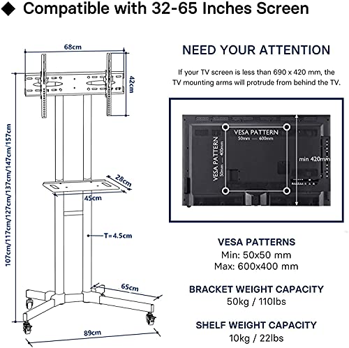 - UNIVERSAL ROLLING TV STAND - This mobile TV stand fits most 32-65 Inch flat & curved TV screens, hold up to 110lbs. VESA compatibility between 100x100 mm to 600x400mm.Please confirm the VESA, weight, size specification of your TV before purchasing.
