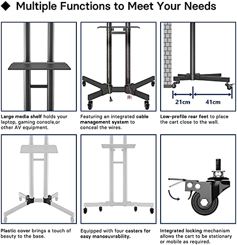 - EASY TO ASSEMBLE - Our mobile TV cart comes with all the necessary accessories and a graphical installation guide.24-hour online after-sales service, always respond quickly, friendly, and helpful. If you have any dissatisfaction, please feel free to contact us (provide the order ID).