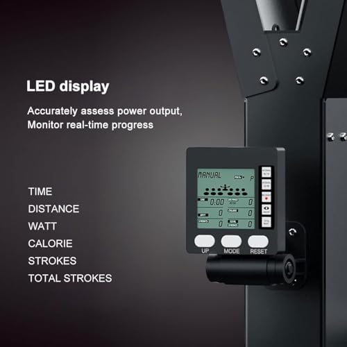 - LED DISPLAY: The skimmer is equipped with an LED display to accurately rate the power output, and shows data like time, distance, watts, calories, strokes, total strokes, etc.