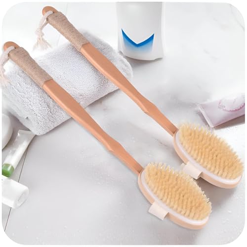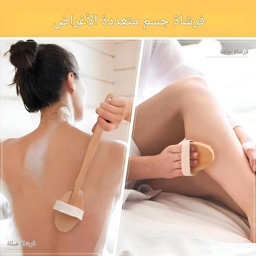 Generic - اداة تقشير البشرة - فرشاة جسم بمقبض خشبي طويل مع اسفنجة بيضاء لانتعاش البشرة الجافة او الرطبة بفعالية (قطعتان)