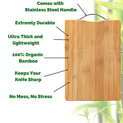 - Stylish reversible and ultra thick design makes bamboo chopping board for kitchen a must for your cooking tasks. This reversible cutting board design offers versatility that allows you to cut food on one both the surface. This wooden chopping block has a handle which makes it easy to take and carry, and meanwhile you can hang the board on the kitchen walls.