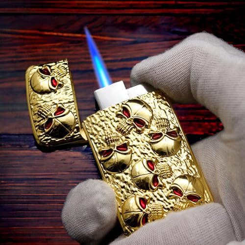 VOGEERA - ولّاعة بتصميم رأس جمجمة جميل للرجال بشعلة نفاثة قابلة لإعادة التعبئة بالبوتان، مصنوعة من المعدن ومقاومة للرياح بلهب ناعم مناسبة للشموع والتخييم في الخارج (بدون غاز) – ذهبي