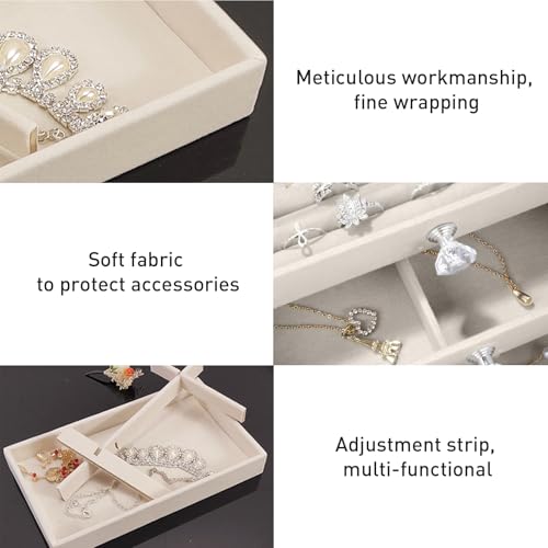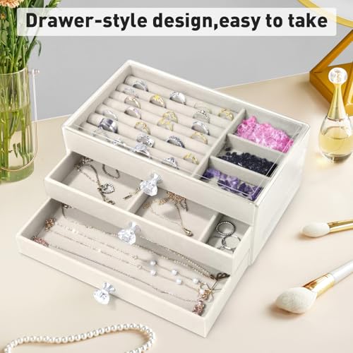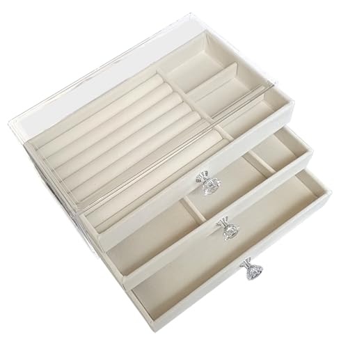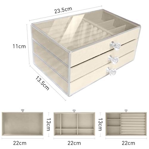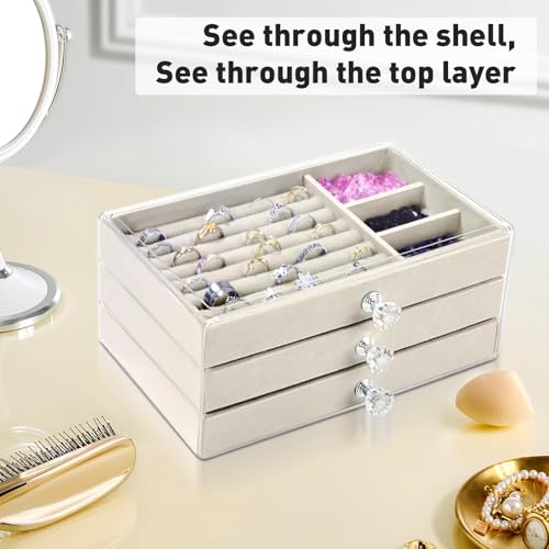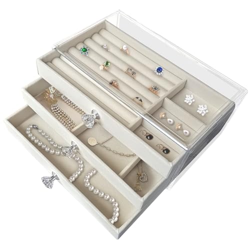 SlaBao - منظم صندوق مجوهرات بثلاثة أدراج، صناديق مجوهرات شفافة، علبة عرض مجوهرات للخواتم والأساور والسلاسل - لون بيج - من سلاباو