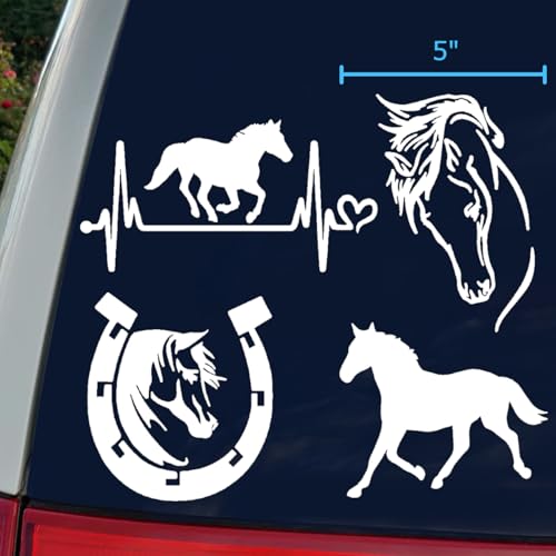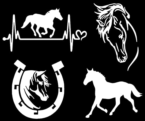 Slaced - Horse Decal 4 Pack: Horse Heartbeat, Horseshoe, Horse Galloping, Detailed Horse Head (White, Large ~5")