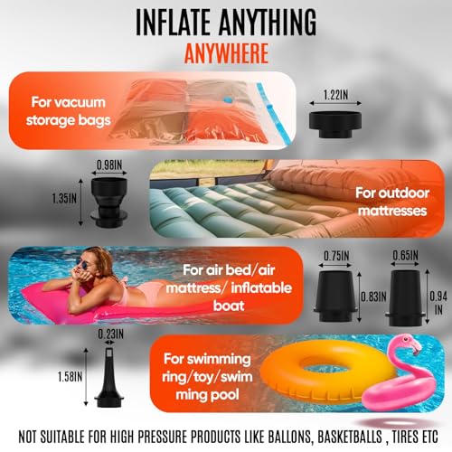 - مغامرة في الهواء الطلق: للمغامرات الخارجية والتخييم، يمكن لهذه المضخة نفخ الألعاب القابلة للنفخ، وسائد هوائية، عوامات مشروبات حمام السباحة، عوامات النهر/البحيرة، عوامات حمام السباحة العملاقة، الطوافات القابلة للنفخ، قوارب التجديف الجلدية، حمامات التجديف، حمامات السباحة القابلة للنفخ، ألعاب حمام السباحة، بالإضافة إلى كرات التمرين، كرات اليوغا، النطاطات، وأنابيب الثلج. إنه حل متعدد الوظائف لجميع احتياجات النفخ الخاصة بك؛