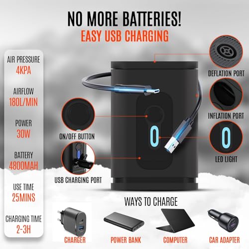 SLEEPHEAD - مضخة هواء محمولة للأغراض القابلة للنفخ، تعمل ببطارية قابلة لإعادة الشحن 1200مللي أمبير في الساعة، مضخة هواء صغيرة للمرتبة الهوائية والسرير وحوض السباحة والوسائد والألعاب القابلة للنفخ من سليب هيد®