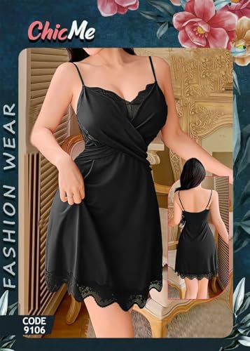 Generic - فستان لانجري قصير سهل الارتداء بحافة دانتيل مع رقبة V - ملابس نوم قصيرة