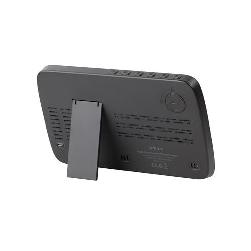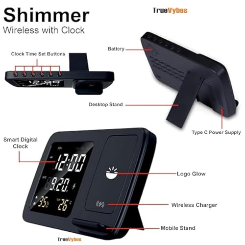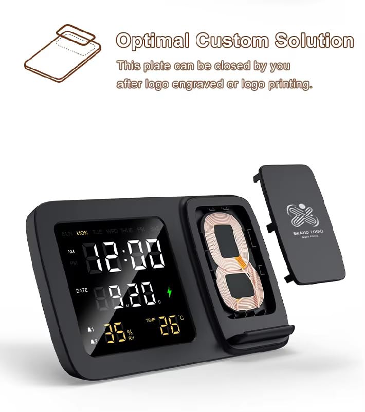 Generic - ساعة مكتب ذكية بشاحن لاسلكي سريع 15 واط وشاشة LCD – منبه رقمي مع مقياس حرارة ورطوبة وتقويم وشعار بإضاءة خلفية – تصميم أنيق أسود متعدد الوظائف للمكتب أو الطاولة