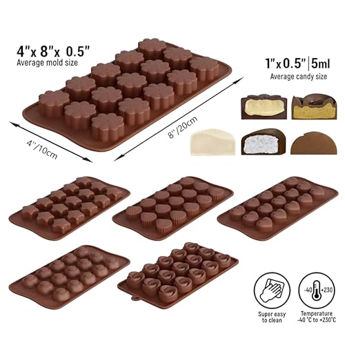- 6 different shapes: The 6-piece set silicone chocolate mold has 6 different shapes: Heart, rose, flower, star, smiley, shell. The delicate patterns make your chocolates more lively and interesting. Silicone mold
