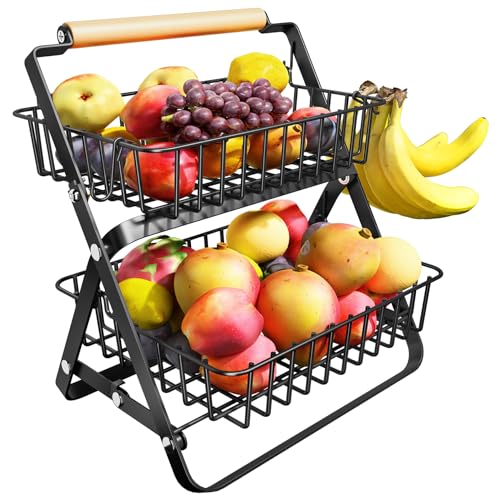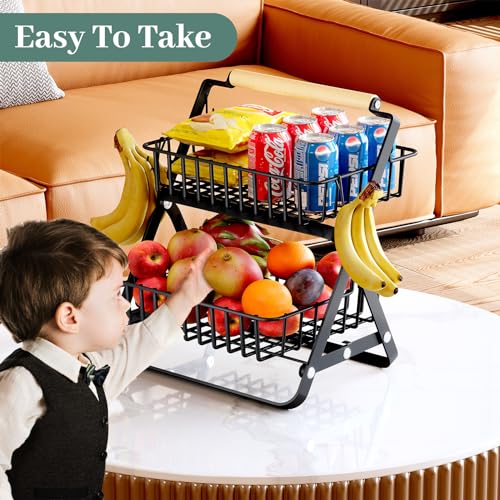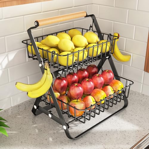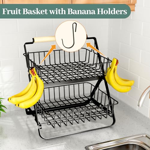 SNTD - SNTD Fruit Basket Stand for Kitchen Counter - 2 Tier Metal Fruit Bowls with Banana Holder, Black