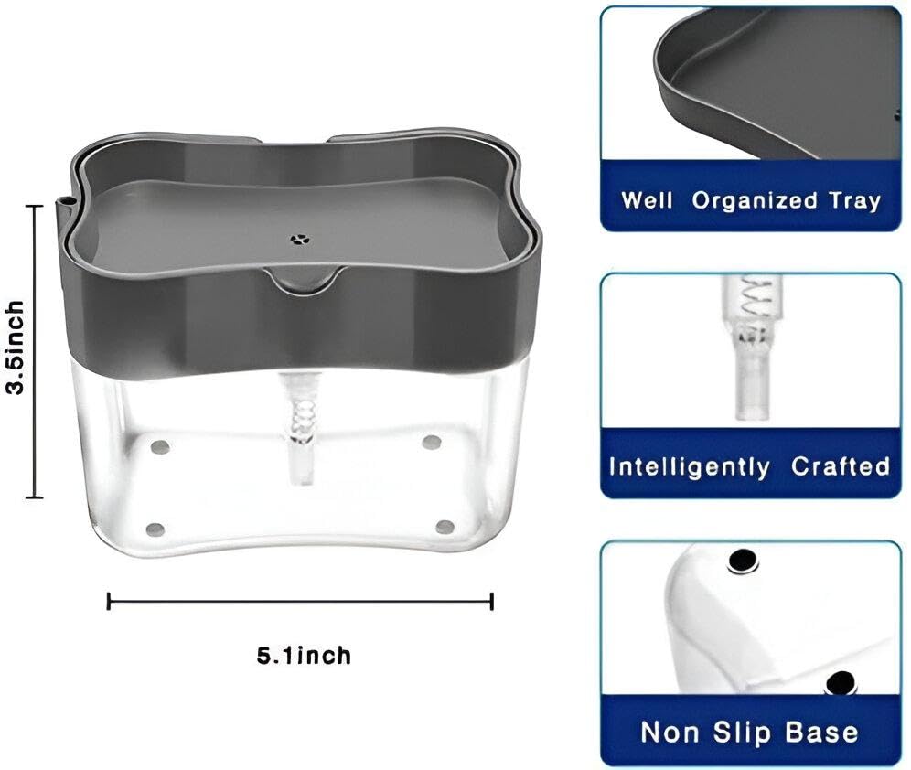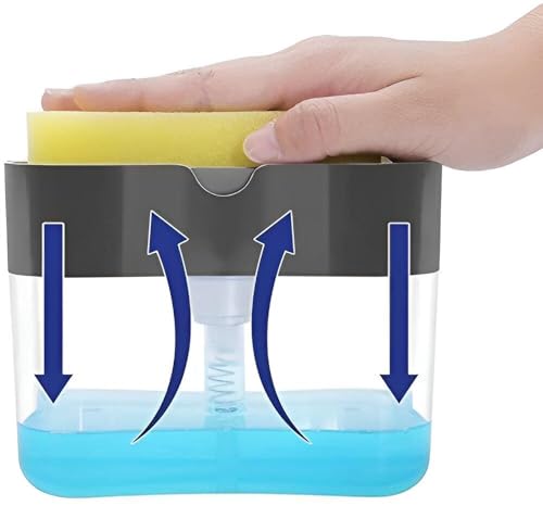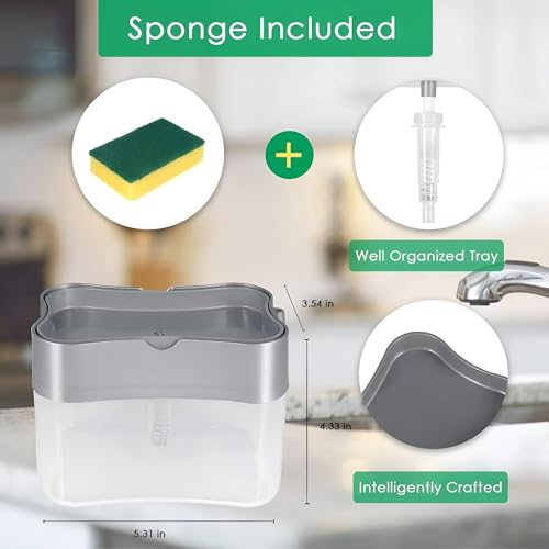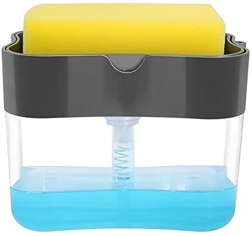 - This 2-in-1 dish soap dispenser features a pump and sponge holder, including a free sponge, all designed in a random color with a standard 400ml capacity, making dishwashing more efficient and organized.