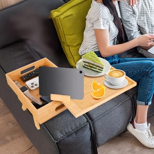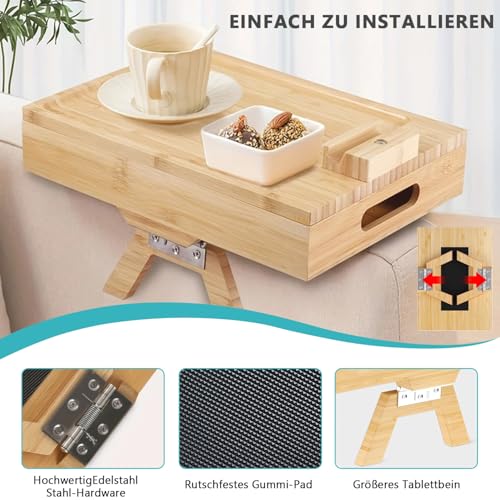 - Natural and durable sofa armrest: our sofa armrest tray is made of high-quality natural bamboo, odourless and environmentally friendly. Durable. The sturdy construction ensures that the armrest stays in place even when heavier items are placed on it, preventing spills and accidents.