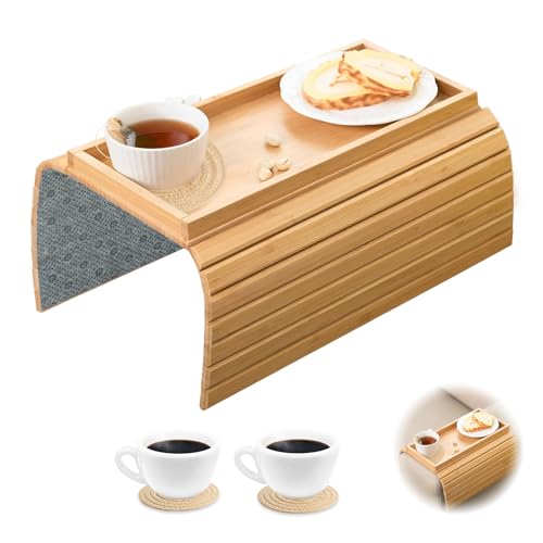 SHILIPAIJC - Sofa Tray Armrest, Bamboo Couch Tray Couch Armrest Table with Cup Mats, Foldable Non-Slip Sofa Tray Sofa Armrest Rest Shelf for Snacks, Remote Control, Cups