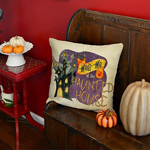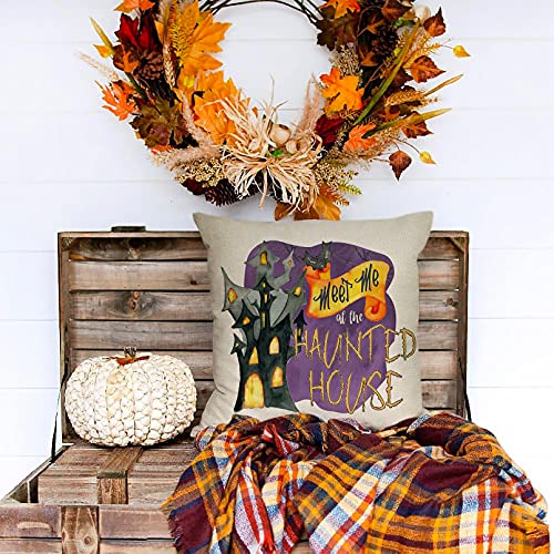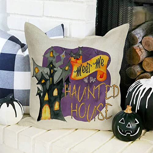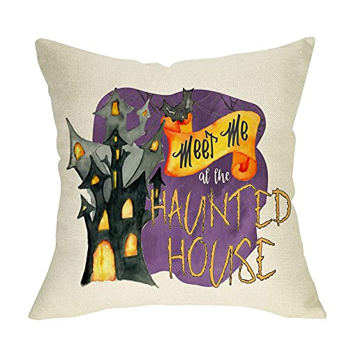 Softxpp - Meet Me at The Haunted House Decorative Halloween Throw Pillow Cover, Castle Spider Web Cushion Case Fall Autumn Home Decoration, Square Pillowcase Decor for Sofa Couch 18 x 18 Cotton Linen