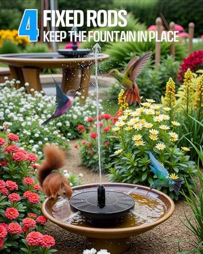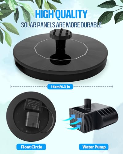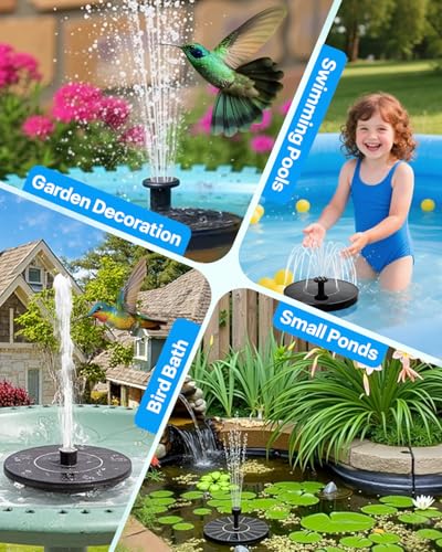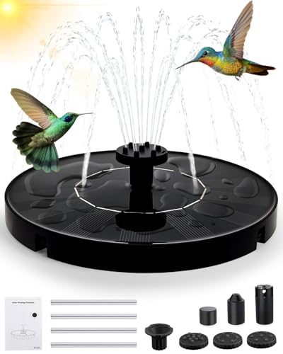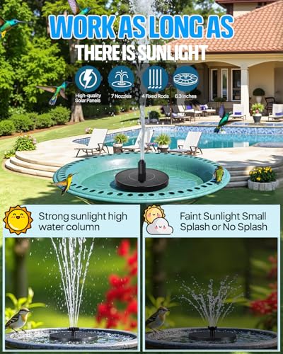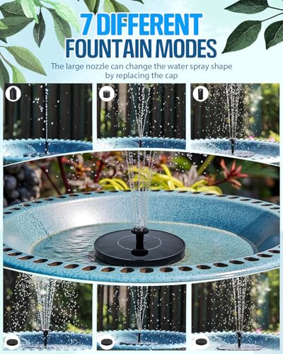 - Unique Features - Upgraded with 7 interchangeable nozzles, the solar bird bath fountain offers more spray patterns than standard 6-nozzle fountains. The built-in anti-collision bar and stabilizer ensure safe and stable operation, even in windy conditions. Its floating design and solar water fountain pump make installation effortless—simply place it in water and let the sun do the work!