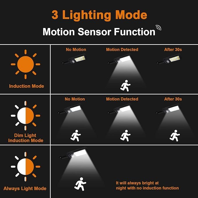 - 3 Modes & Remote Control: Mode 1: automatically turns on when motion detection and pause after 30 seconds Mode 2:Always run it in the dark,and it will be brighter when you detect the movements of objects. Mode 3: Fixed in the dark light Remote control is convenient for you to adjust different positions. Note 2: Please take out the transparent insulation paper first when you use the remote control.